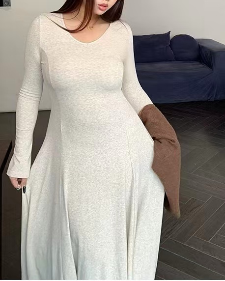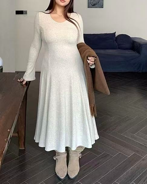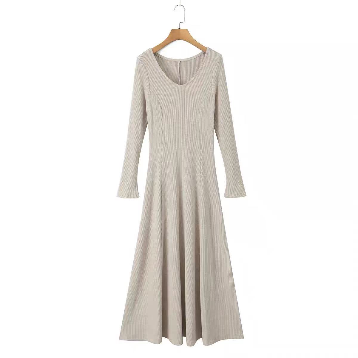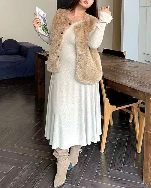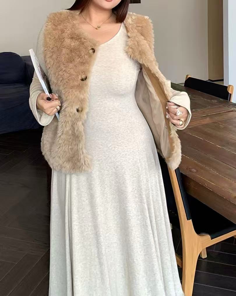 CRUSHPEACH Cloud Puff Soft and Thick Wool Camel Fishtail V-Neck midi Dress