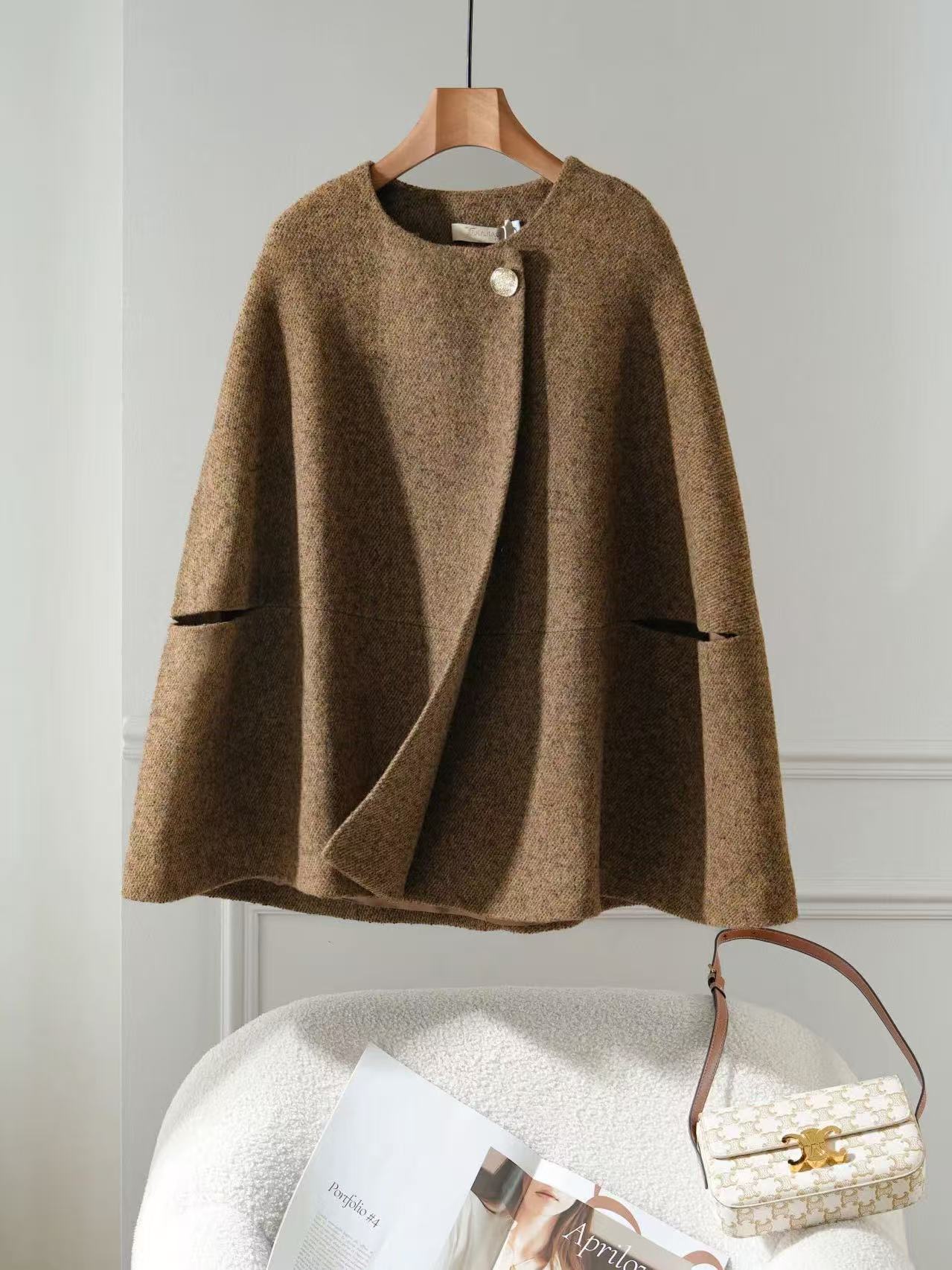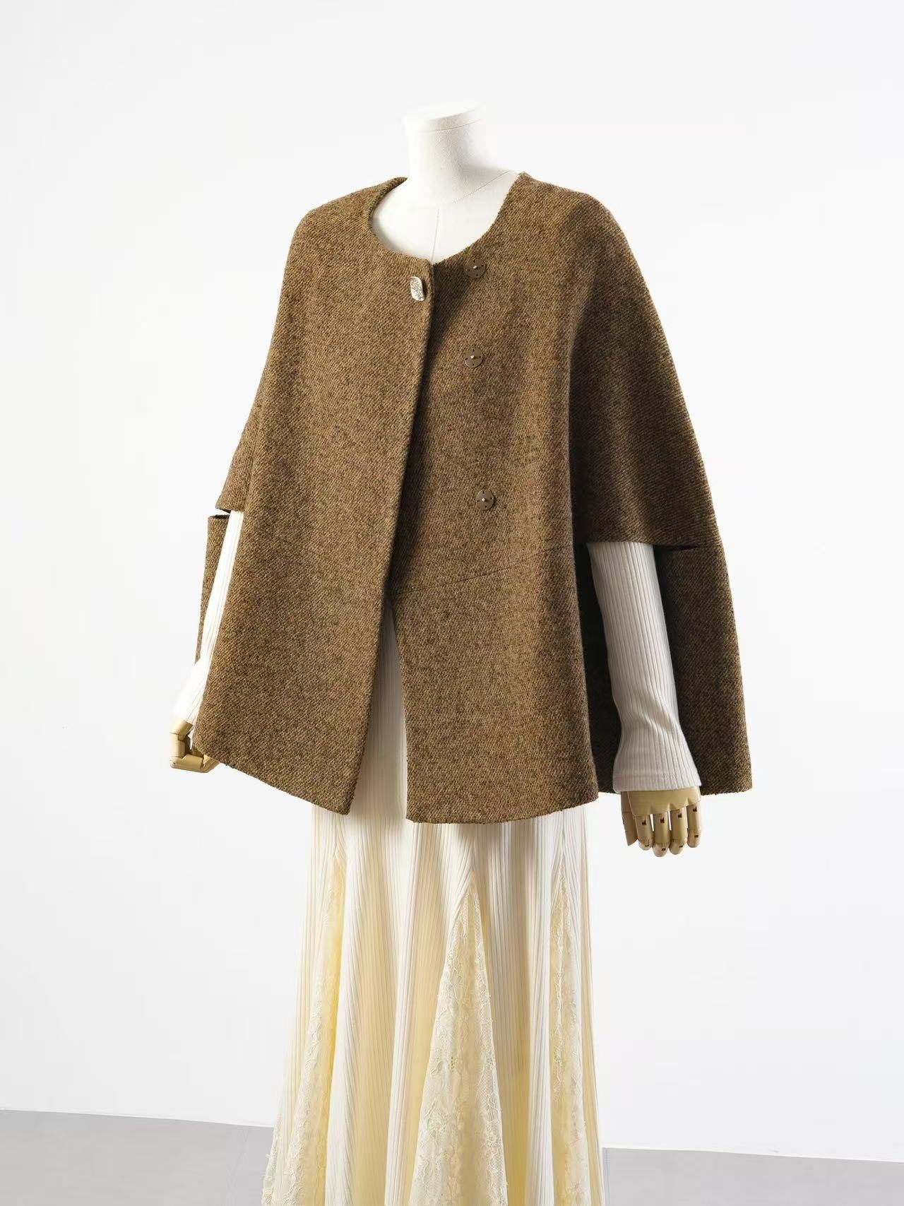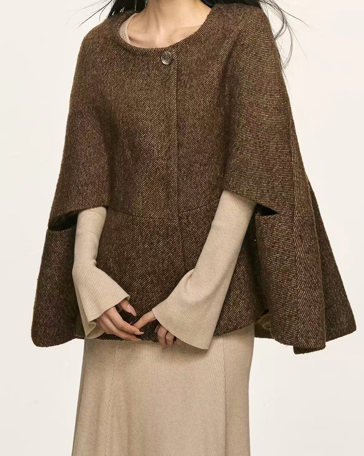 CRUSHPEACH Dark camel wool sheaf brooch cape coat