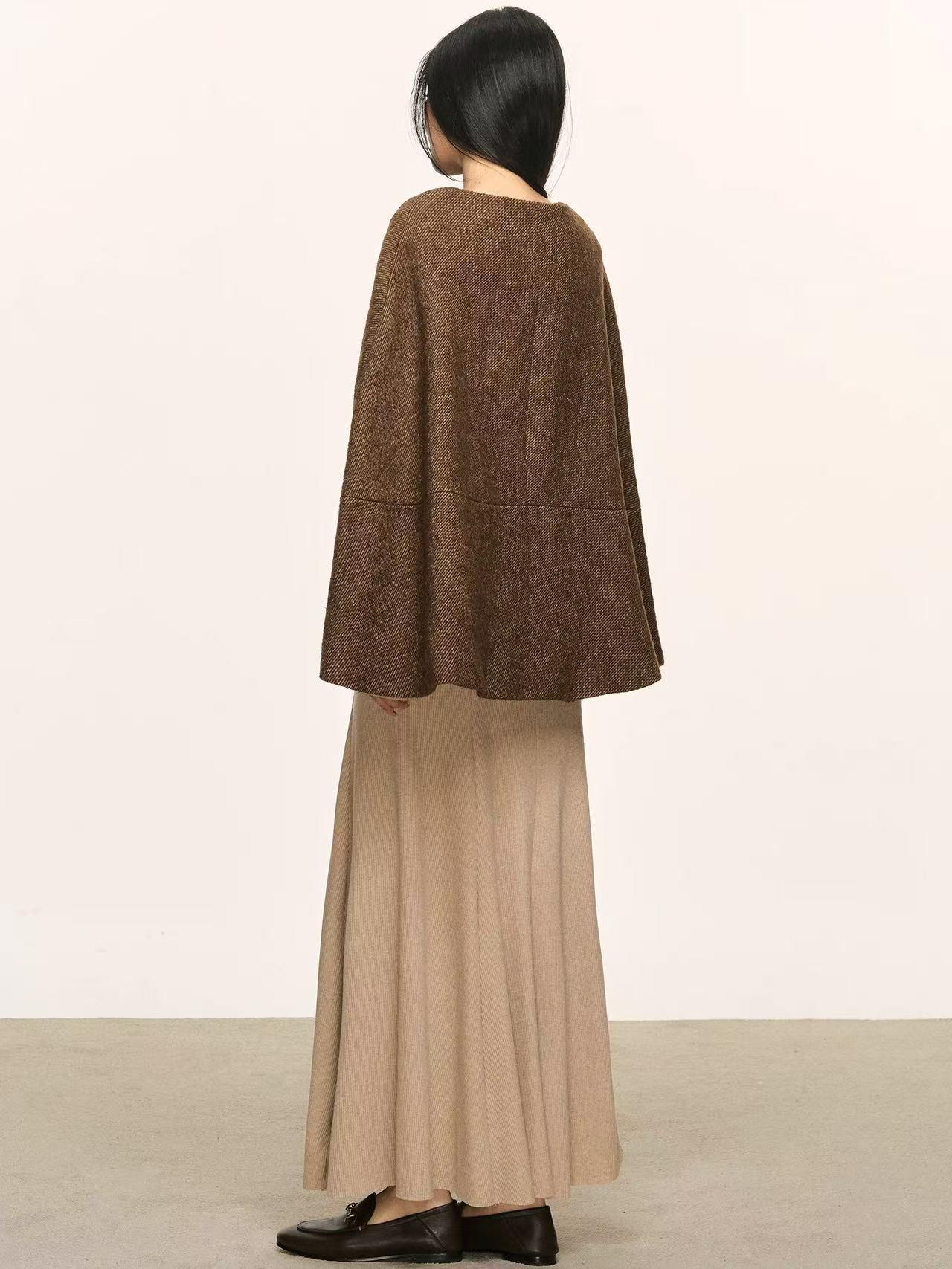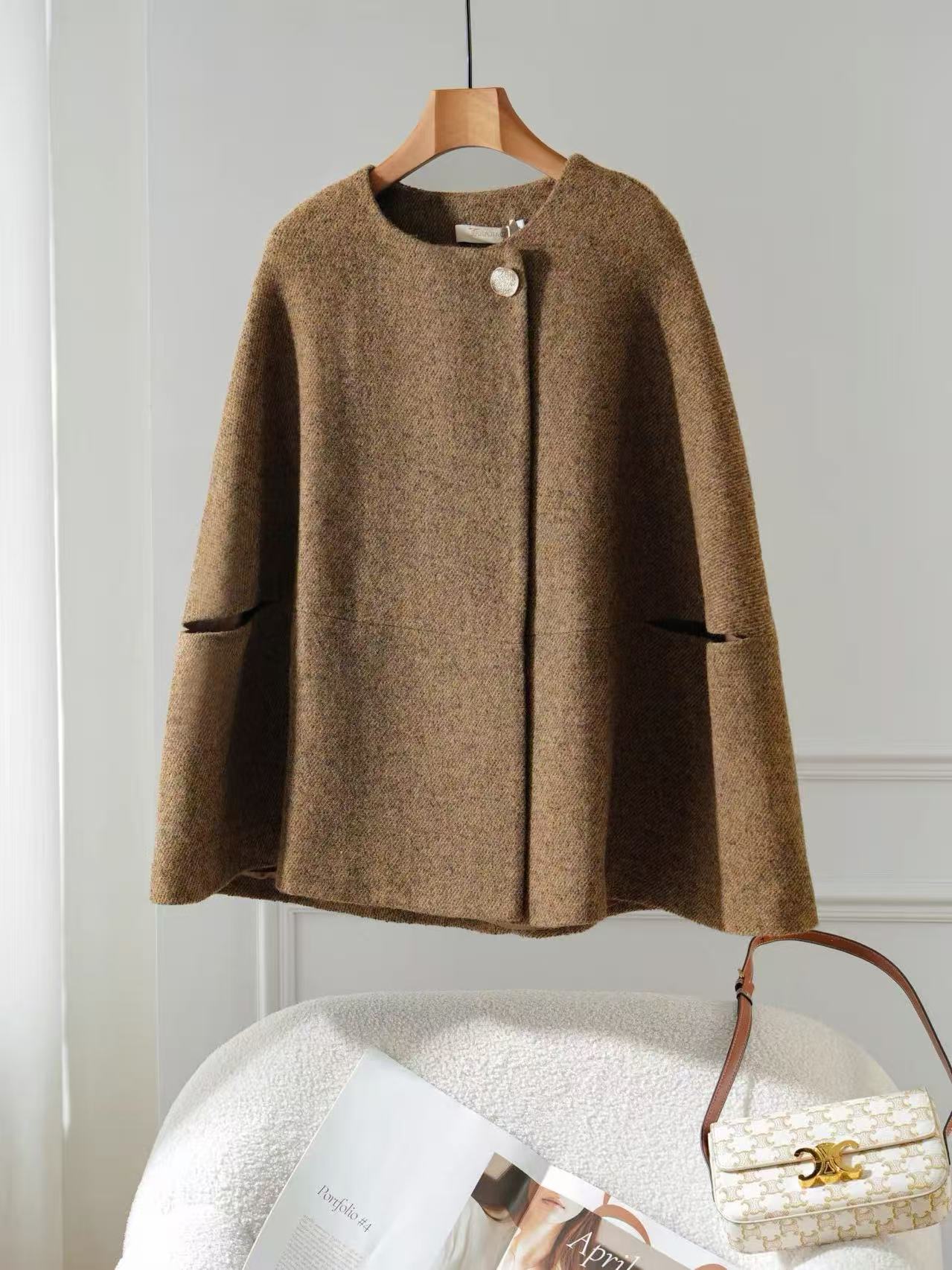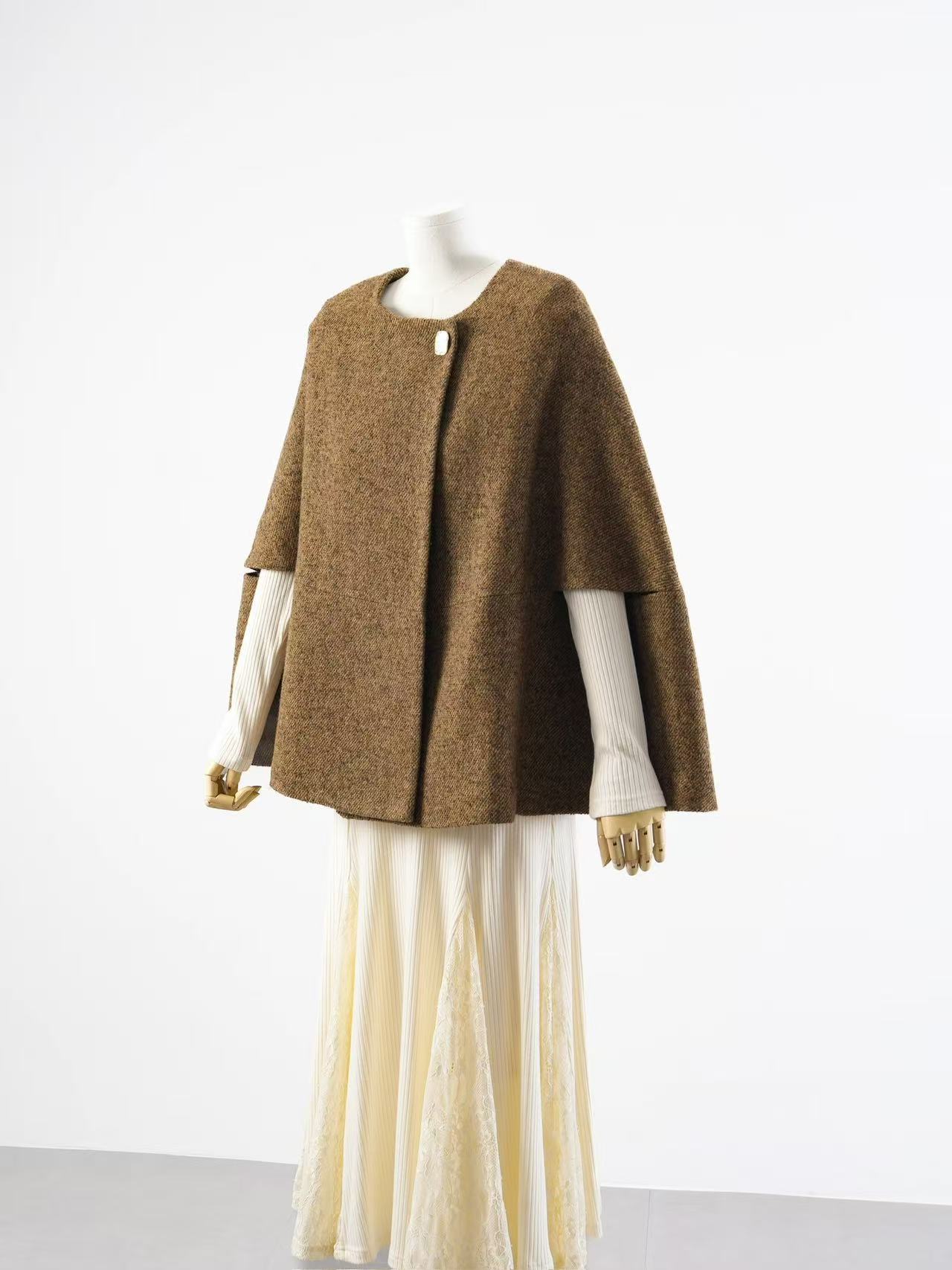 CRUSHPEACH Dark camel wool sheaf brooch cape coat