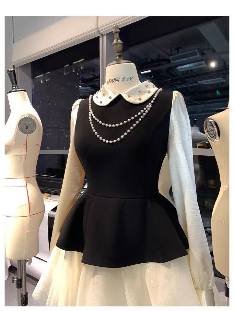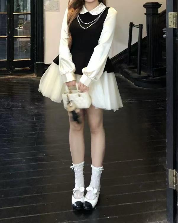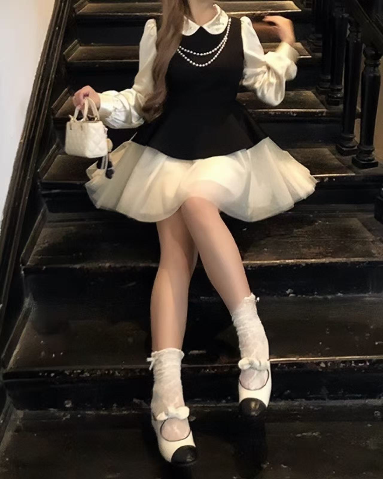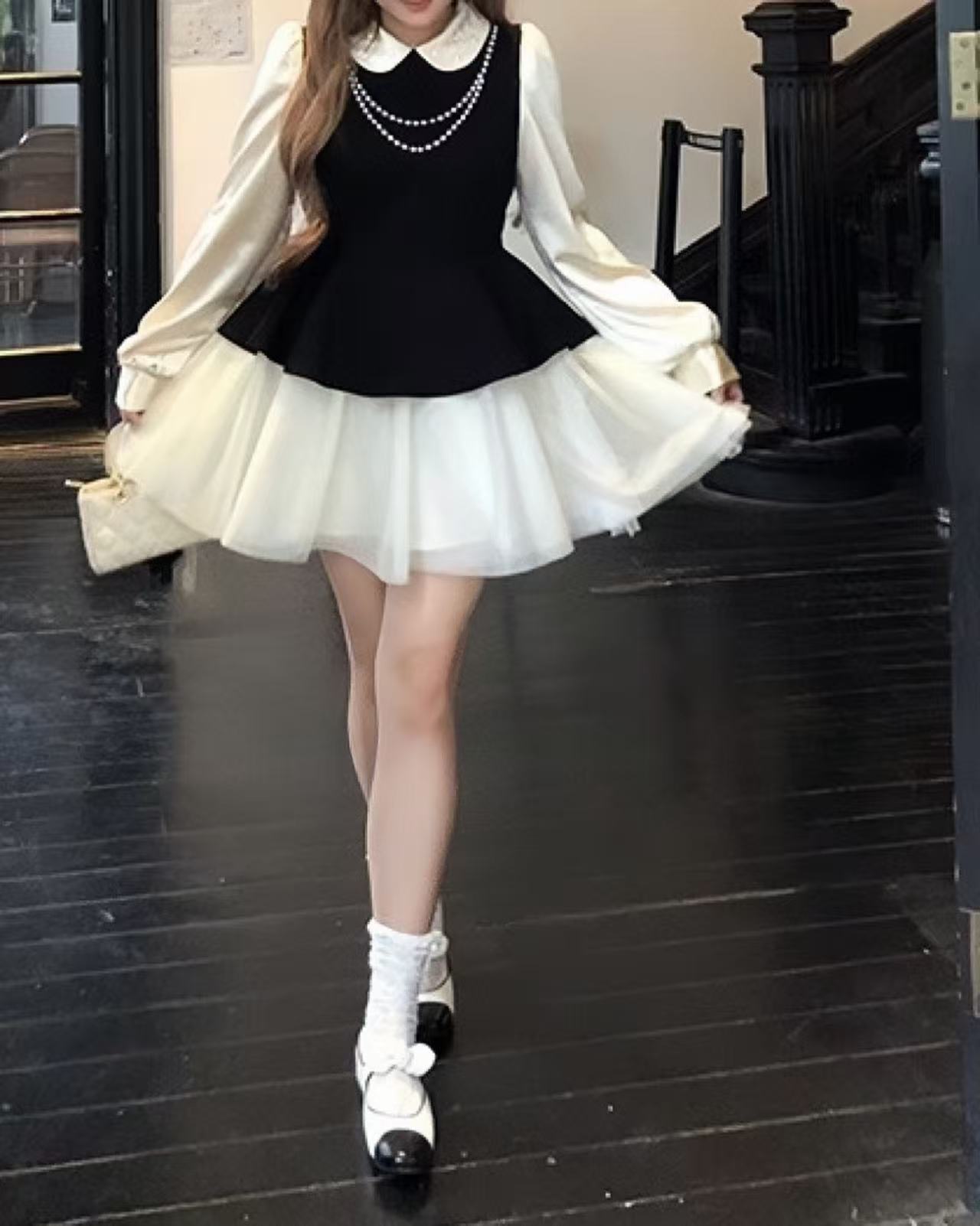 crushpeach Christmas Silk-Sleeve Collar-Patch Pearl puff MINI Dress