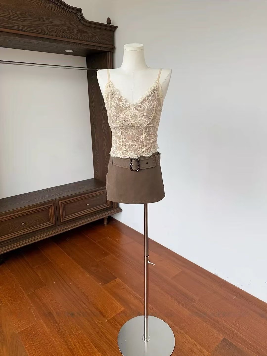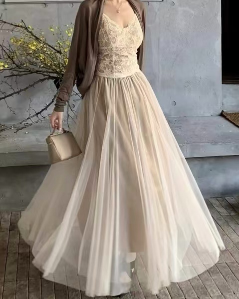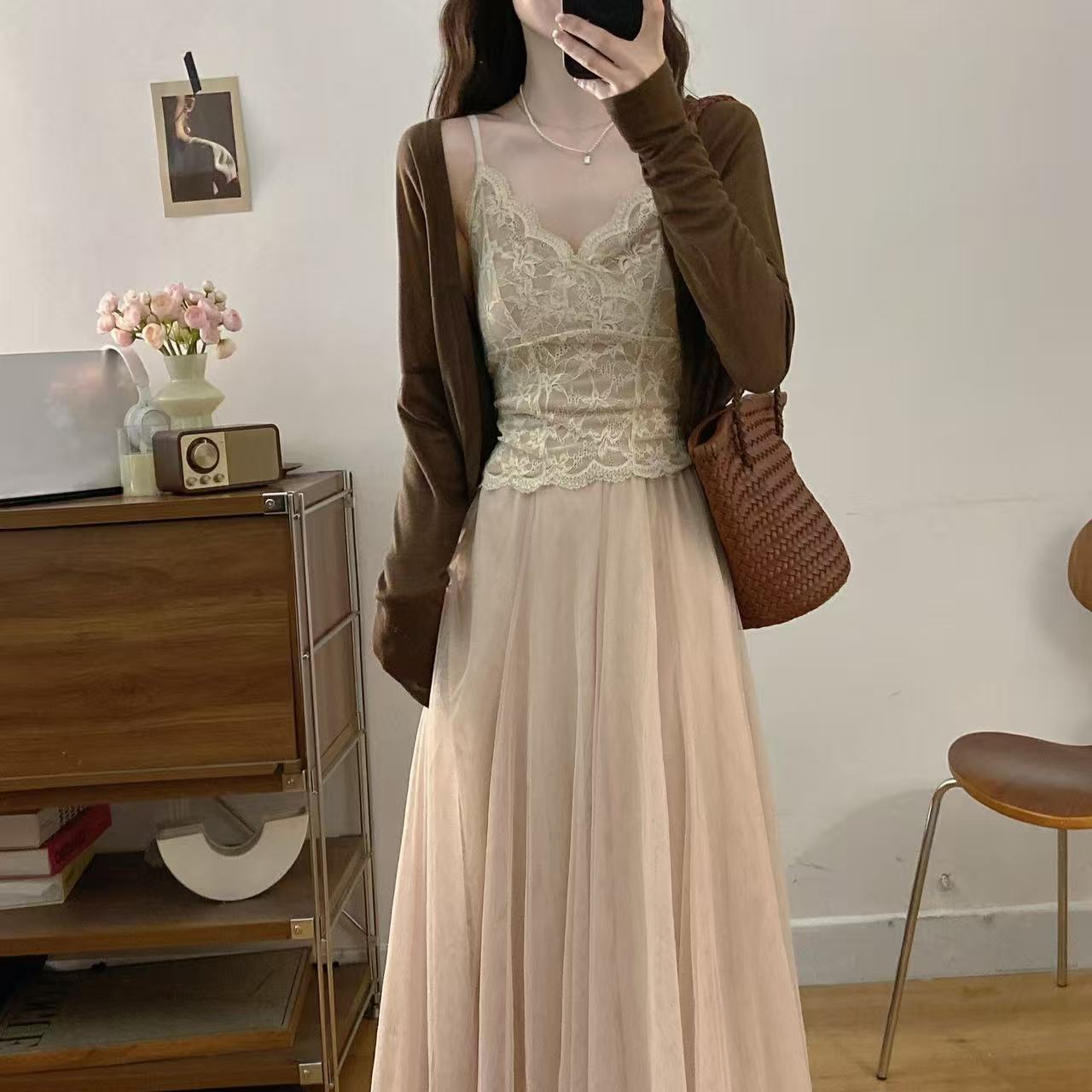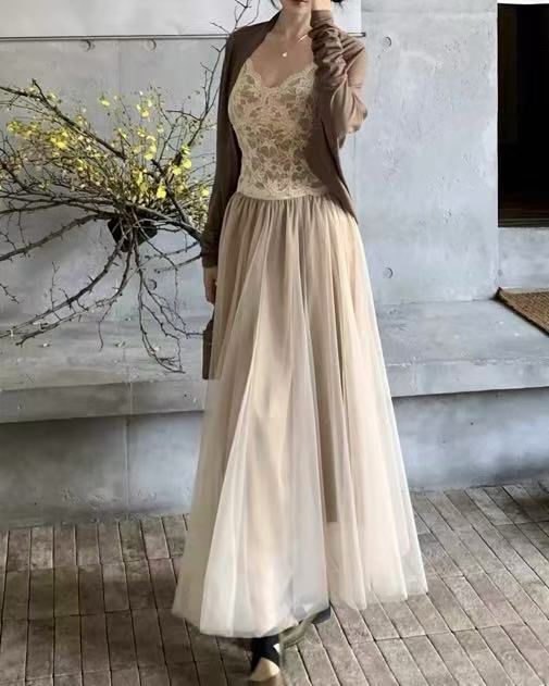 CRUSHPEACH Delicate adjustable shoulder strap beige lace camisole + camel cardigan