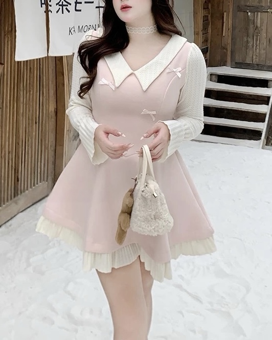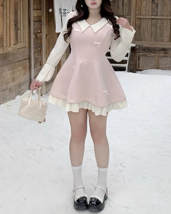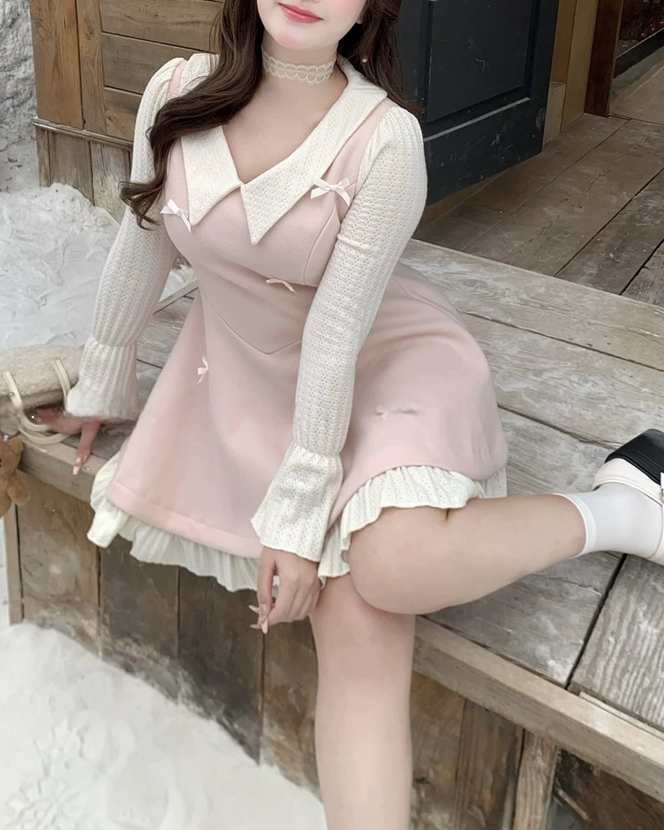 CRUSHPEACH Pink Bow Wool Lace Patchwork A-Line MINI Dress